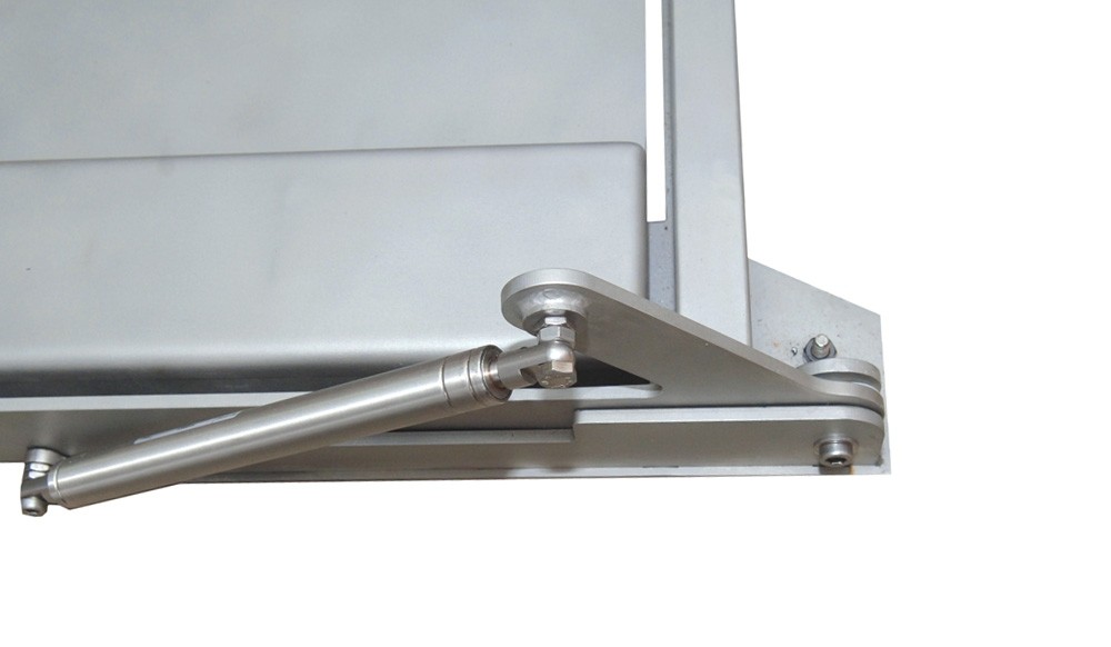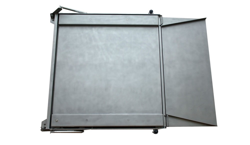 Durchfahrwaagenplattform in Edelstahlausführung (1.4301) mit einer Rampe und mit Gasdruckfedern in Edelstahl zur leichten Anhebung der Wägeplattform zwecks Reinigung,